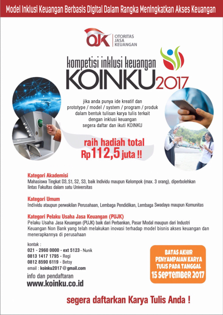 Kompetisi Inklusi Keuangan KOINKU 2017 Kategori Akademisi Mahasiswa Tingkat D3, S1, S2, S3, baik Individu maupun Kelompok (max. 3 orang), diperbolehkan lintas Fakultas dalam satu Universitas Kategori Umum Individu ataupun perwakilan Perusahaan, Lembaga Pendidikan, Lembaga Swadaya maupun Komunitas Kategori Pelaku Usaha Jasa Keuangan (PUJK) Pelaku Usaha Jasa Keuangan (PUJK) baik dari Perbankan, Pasar Modal maupun […]